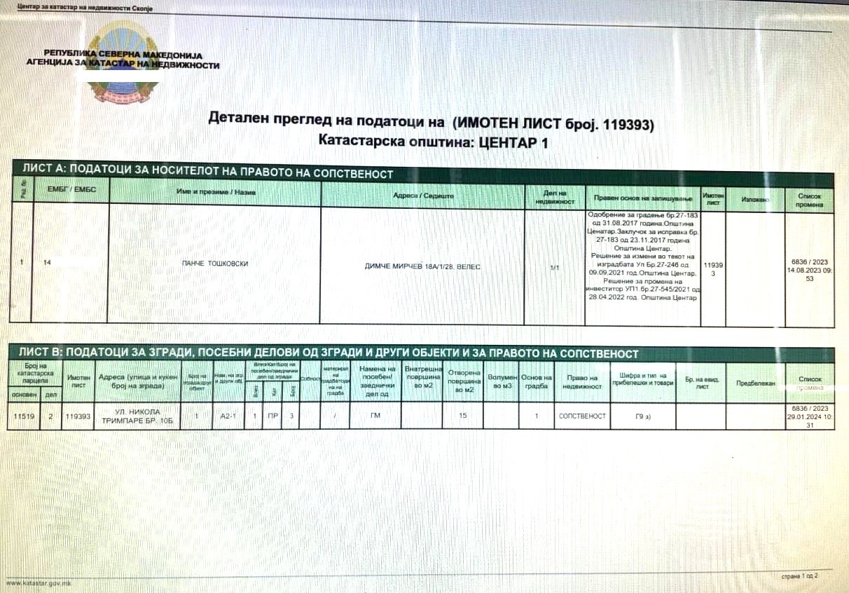 Она што е особено интересно е дека имот во оваа зграда, покрај Јанушев, има и министерот за внатрешни работи, Панче Тошковски. Еве го неговиот имотен лист.