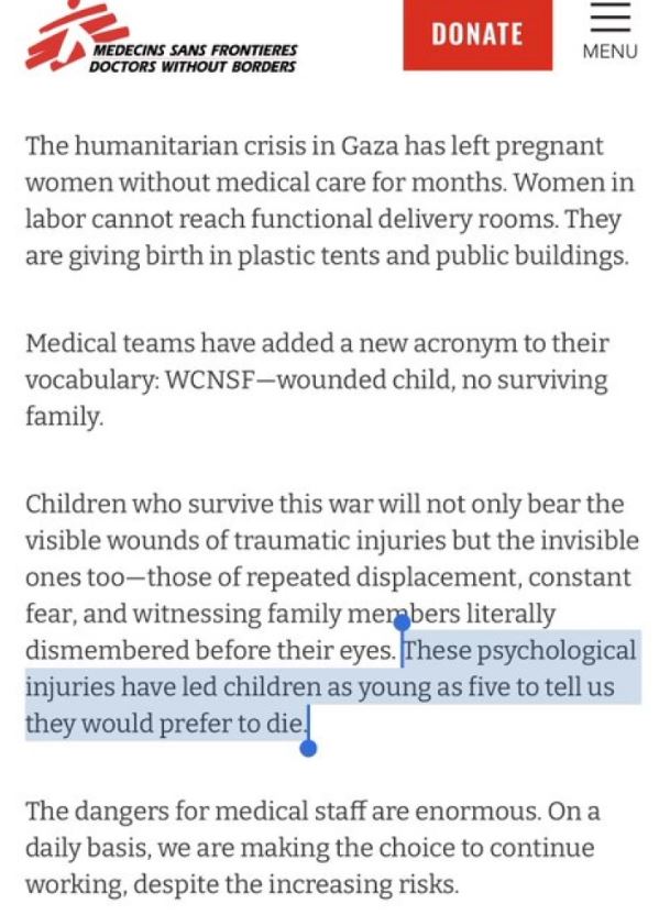 Генералниот секретар на меѓународната хуманитарна организација „Лекари без граници“, Кристофер Локјер пред Советот за безбедност на Обединетите нации рече дека медицинските тимови во Појасот Газа додале нова кратенка во нивниот вокабулар: WCNSF – Повредено дете, нема преживеани родители.