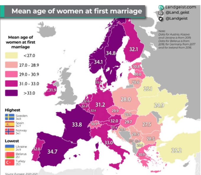 Во повеќето европски земји, жените стапуваат првпат во брак на над 30 годишна возраст. Забележлива е разликата во западна и во источна Европа, колку се оди позапад, толку е поголема просечната возраст.