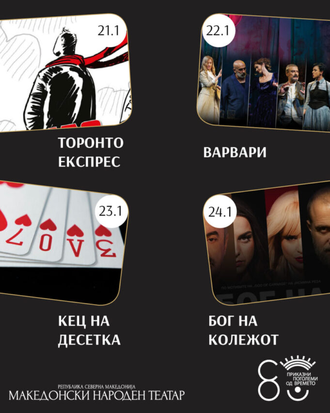 Македонскиот народен театар, 2026 година ја започнува со силен уметнички интензитет и разновидна театарска програма. Првиот месец во годината носи богат репертоар, кој опфаќа сценски спектакли, современи и класични драми и стендап-изведби на големата и малата сцена.