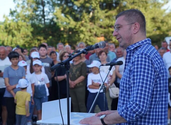 „На овие избори изборот е помеѓу тоа Македонија да биде повторно горда, да биде Македонија достојна, да биде Македонија твоја ваша или пак да биде Македонија засрамена, понижена, ограбена. Тоа е изборот. Ве молам немојте да наседнувате на реториката на власта која што сака да ви ја наметне дека тие биле за ЕУ, Европски фронт, а ние сме биле против ЕУ. Тоа не постои. Изборот е или Македонија ваква каква што си ја сакаат огромно мнозинство граѓани или Македонија онаква каква што ја сакаат овие неколкумина од ДУИ и измеќарите од СДСМ“, дециден е Мицкоски.