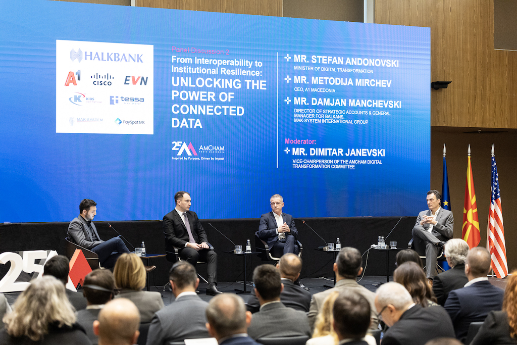 Следеше панел-дискусија каде министерот за дигитална трансформација Стефан Андоновски, заедно со Методија Мирчев од А1 и Дамјан Манчевски од MAK-SYSTEM, зборуваа за поагилна интероперабилност во рамки на институциите и во односот со бизнис секторот, како и потребата од имплементирање на веќе донесената регулатива и постојната дигитална инфраструктура. Говорниците се осврнаа и на важноста на јасните стандарди, координацијата и заштитата на податоците во создавањето модерни јавни услуги.