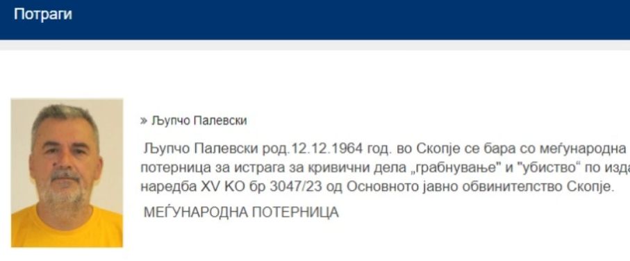 – Љупчо Палевски род.12.12.1964 год. во Скопје се бара со меѓународна потерница за истрага за кривични дела „грабнување” и “убиство“ по издадена наредба XV KO бр 3047/23 од Основното јавно обвинителство Скопје, објавено е на веб страницата на МВР.