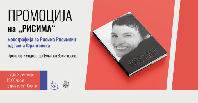 Во среда, 3 декември, со почеток од 19:00 часот во „Јавна соба“, Скопје, ќе се одржи промоцијата на монографијата „Рисима“ од Јасна Франговска, посветена на најпознатата и најуспешна македонска кореографка за современ танц ‒ Рисима Рисимкин. Изданието е на „ПНВ Публикации“ и објавено е со поддршка од Министерството за култура и туризам.