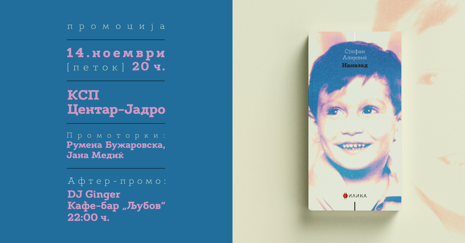 В петок ќе се одржи промоцијата на втората збирка раскази на Стефан Алијевиќ, „Наназад“ во издание на издавачката куќа Илика. Настанот ќе започне во 20:00 часот, во КСП Центар-Јадро, а промоторки на книгата ќе бидат Румена Бужаровска и Јана Медиќ. По промоцијата, организаторите покануваат на афтер-промо забава во кафе-бар „Љубов“ со DJ Ginger.