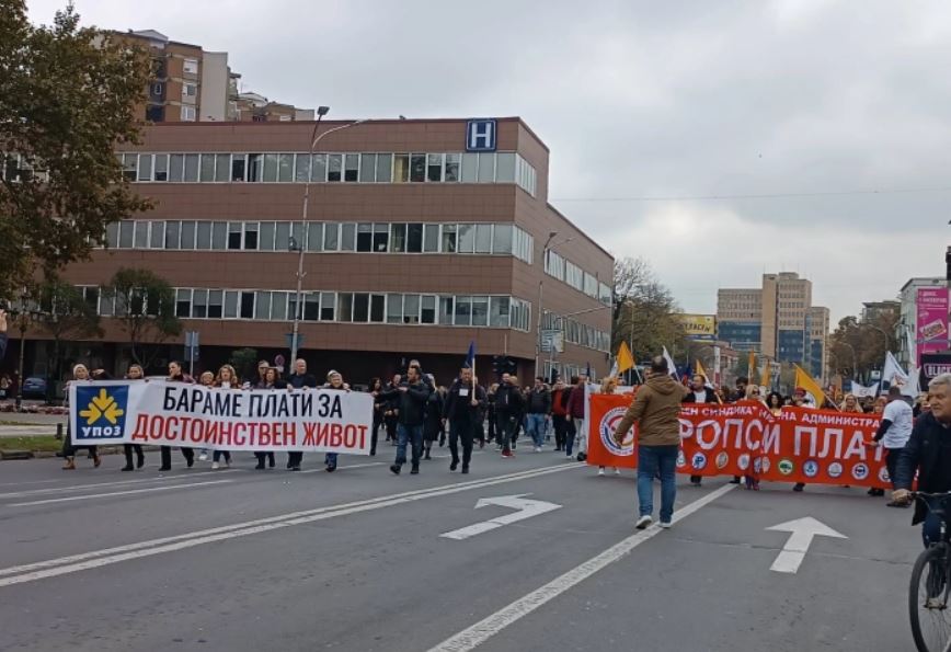 Вработените од судската и јавнообвинителската служба, Фондот за здравство, како и од Канцеларијата на Народниот правобранител, во организација на Синдикатот на работниците од управата, правосудните органи и здруженијата на граѓани (УПОЗ) денеска излегоа на протест пред Собранието, од каде ги повикаа пратениците од сите политички партии, пред кои веќе е предлог буџетот за следната година, да ги поддржат во нивните барања за покачување на платите.