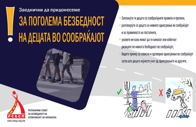 Децата се една од најранливите категории учесници во сообраќајот. Токму затоа неопходно е да се вложат заеднички напори за унапредување на нивната безбедност во сообраќајот. Треба да се има предвид дека тие се рамноправни учесници во сообраќајот на патиштата и да се посвети особено внимание на нивната едукација од областа на сообраќајните правила и прописи. Неопходноста за помош и едукација од возрасните посебно е изразена кај децата од помала возраст. Затоа Републичкиот совет за безбедност на сообраќајот на патиштата советува: