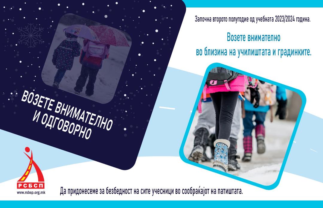 Започна второто полугодие од учебната 2023/2024 година. После зимскиот распуст на учениците, зголемена е фрекфенцијата на сообраќајот во близина на воспитно-образовните установи. Затоа Републичкиот совет за безбедност на сообраќајот на патиштата повикува на поголема внимателност на сите учесници во сообраќајот.