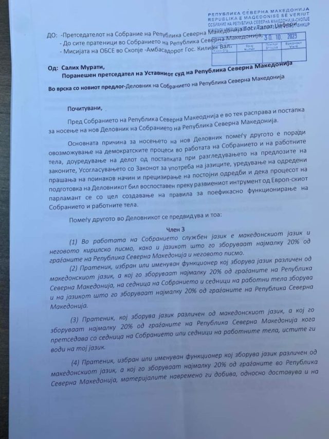 -Денеска писмено им се обратив до претседателот на Собранието, г. Талат Џафери, до сите пратеници во Собранието на Република Северна Македонија и до шефот на мисијата на ОБСЕ, амбасадорот г. Килијан Вал, во кое истакнав дека членовите 3, 19 и 35 од Предлог-Деловникот, кои ја предвидуваат употребата на јазиците на парламентарните седници и работните групи, не се во согласност со многу членови од нашиот Устав, со стекнатите права на малцинските заедници, меѓународното право, европските вредности и компаративната судска практика.