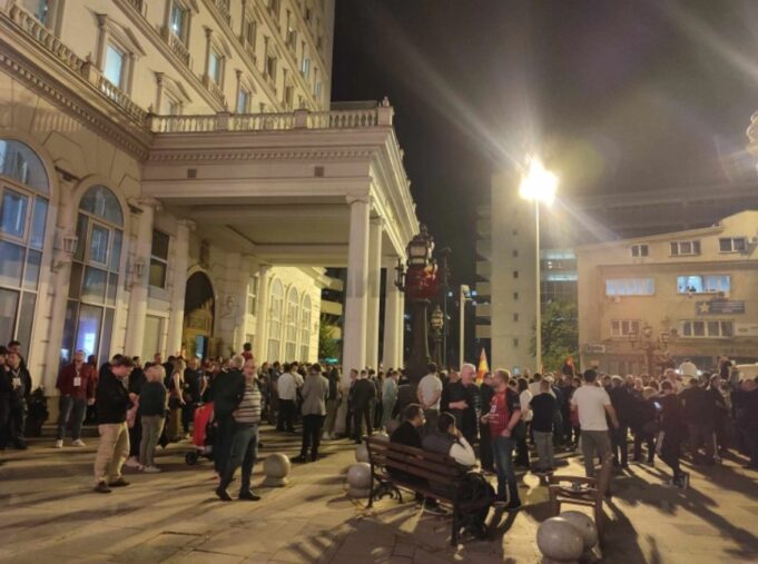Пред седиштето на ВМРО-ДПМНЕ во Скопје се собираат поддржувачи во пресрет на резултатите од вториот круг на претседателските избори и парламентарните избори.