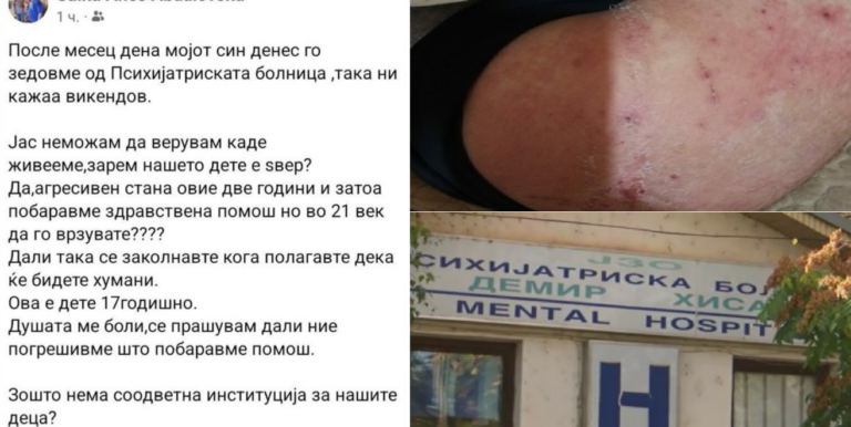 17-годишно момче со аутизам било врзувано и малтретирано за време на престој во психијатриска установа во Македонија, обвинуваат родителите на момчето. – После месец дена, мојот син денес го зедовме од психијатриска болница, така ни кажаа викендов. Јас не можам да верувам каде живееме, зарем нашето дете е ѕвер? Да, агресивен стана овие две години … Continue reading Скандалозно-Момче со аутизам врзувано и малтретирано во психијатриска болница во Демир Хисар