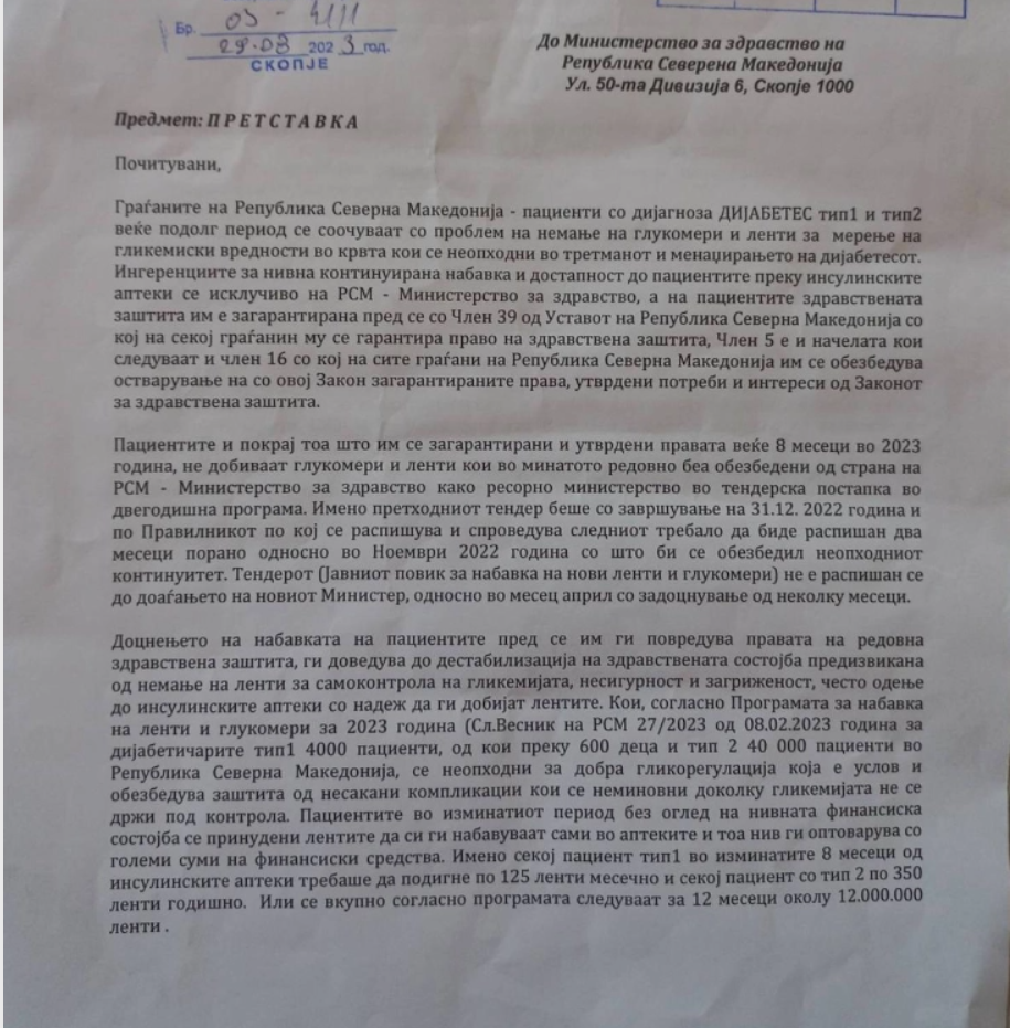 Претходната тендерска набавка беше со важност до 31.12.2022 година, следната требало да биде распишана два месеци однапред, до тоа не дошло од кои причини не сме официјално запознаени, се доцнело до месец април и поради сите тие причини пациентите со дијабетес се оставени без неопходните глукомери и ленти од 01.01.2023 година до денес односно 9 месеци. Последиците од нерегулирани гликемиски вредности и компликациите кои настануваат како причина од истото како што се кардиоваскуларните заболувања, дијабетична полиневропатија, нефропатија, ретинопатија и други кои не се лекуваат туку само се живее со нив се добро познати на сите. Периодот во кој пациентите се оставени без неопходните за нормален живот глукомери и ленти е долг веќе 9 месеци со што на пациентите им е повредено правото за здравствена заштита загарантирано со Устав на РСМ, Законот за здравствена заштита и Законот за правата и заштина на пациенти, а воедно и им е предизвикана материјална штета бидејќи сите пациенти во изминатиот период лентите ги купуваат во аптеките со сопствени средства.