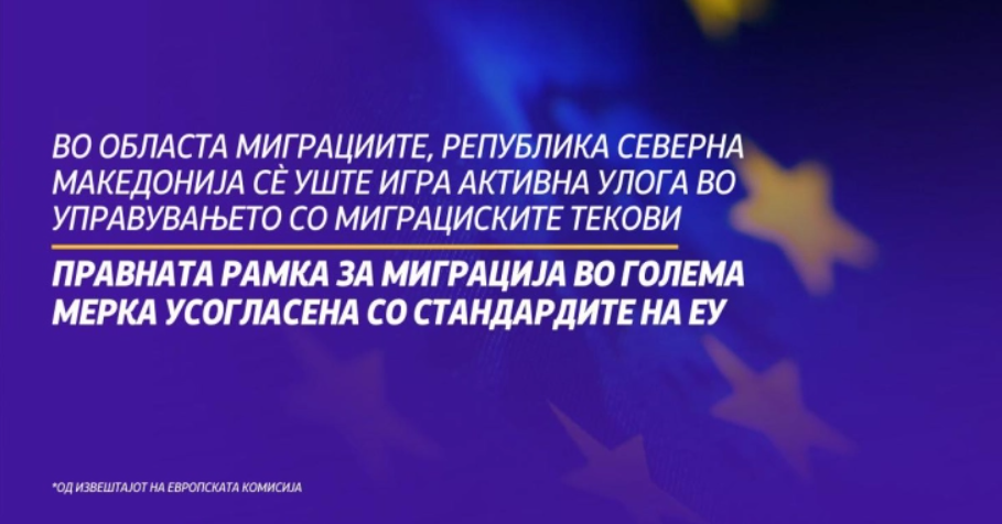 Според извештајот на Европската комисија, земјата продолжи да игра активна улога во управувањето со мешаните миграциски текови. Европската комисија ги препознава сите активности направени на јужната граница за спречување на илегалната миграција и криумчарењето на мигранти, а пофалени се и сите направени дополнителни напори за обезбедување основни услови за живот и услуги за сите мигранти во Северна Македонија, посочува министерот за внатрешни работи Оливер Спасовски.