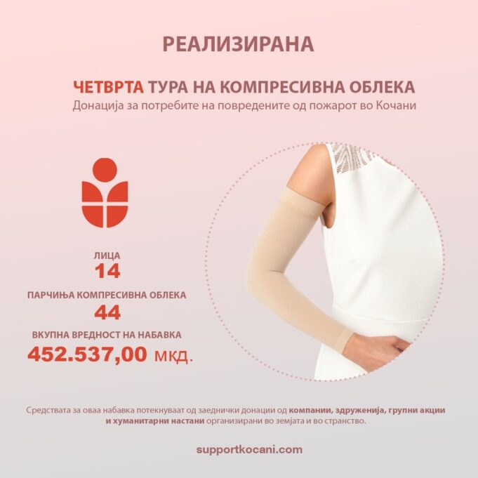 Граѓанската иницијатива Support Kocani продолжува со поддршката за засегнатите лица од пожарот во Кочани и ја финализираше четвртата испорака на специјализирана компресивна облека. Новата пратка, која веќе е доставена до Општата болница во Кочани, претставува значаен чекор во обезбедувањето континуирана терапија и квалитетна рехабилитација.