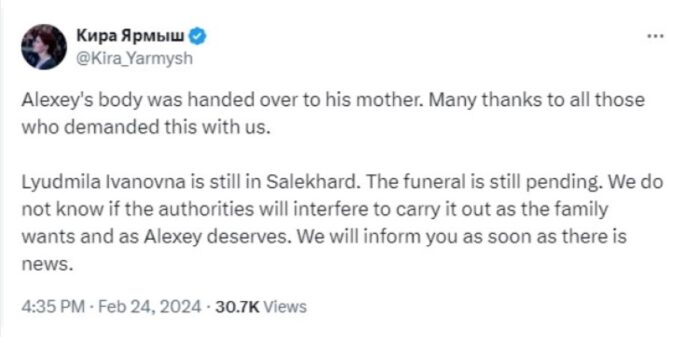 „Људмила Ивановна се уште е во Салехард. Погребот се уште се чека. Не знаеме дали властите ќе се мешаат да се спроведе како што сака семејството и како што заслужува Алексеј. Ќе ве известиме штом има новости“, напиша Јармуш.