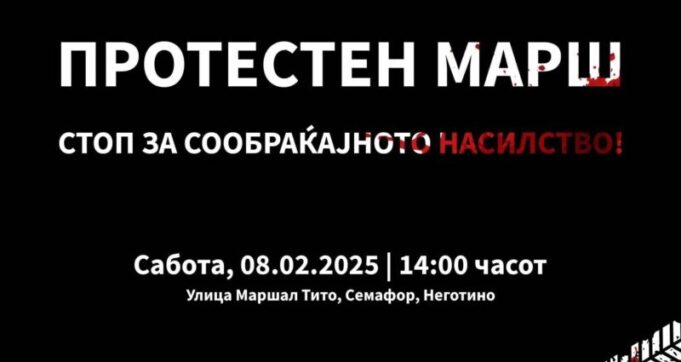 Протестен марш под мотото „Стоп за сообраќајното насилство“ ќе се одржи в сабота во Неготино, објавија организаторите на настанот на социјалните мрежи. Маршот ќе започне во 14 часот на улица „Маршал Тито“.