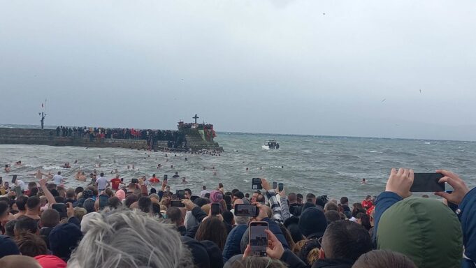 Васко Довлев од Варош беше најсреќниот меѓу многубројните верници кои денеска на Богојавеление – Водици скокнаа во Охридското Езеро и го извади осветениот крст.