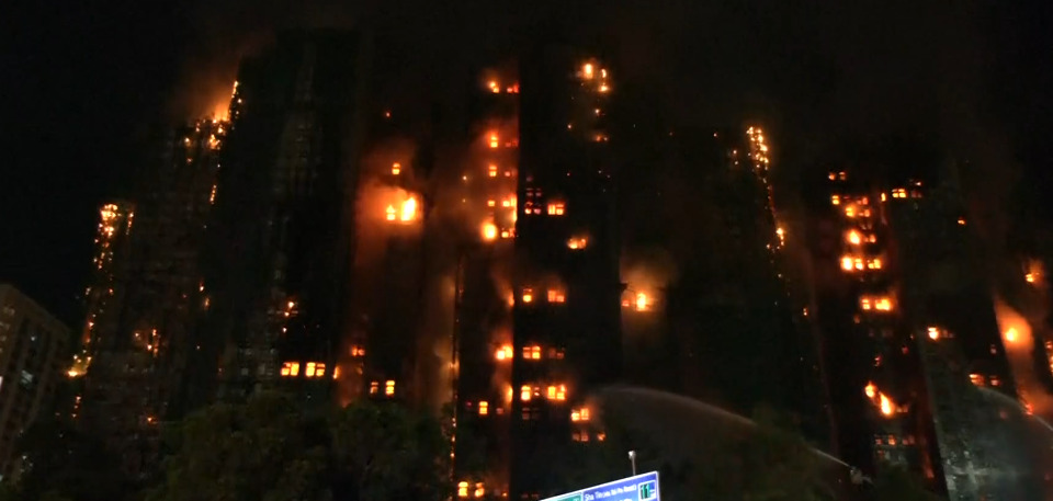 Драматичните снимки од населбата Тај По прикажуваат густ чад и пламен што излегува од неколку кули во станбениот комплекс Ванг Фук Корт.