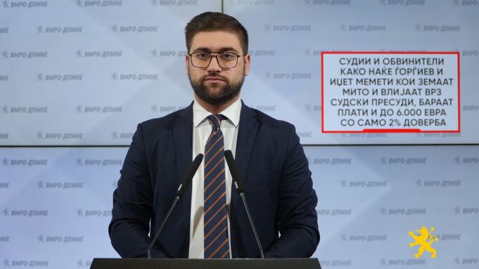 Судиите и обвинителите како Наќе Ѓорѓиев и Иџет Мемети кои земаат мито и влијаат врз судски пресуди, бараат плати и до 6.000 евра со само 2% доверба. Македонската јавност заслужува да знае кој се овие поединци од судската и обвинителската фела, кои се имплицирани во вакви судски пресуди со своите влијанија, а од друга страна со 2% доверба сакаат зголемување на платите, вели Валентин Манасиевски, член на ЦК на ВМРО-ДПМНЕ.