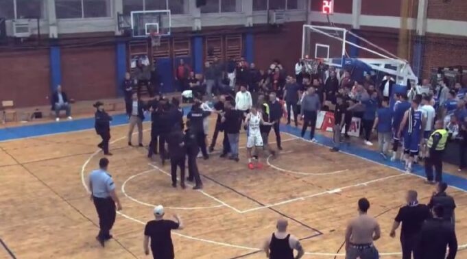 Двајца жители на Куманово се приведени откако синоќа, за време на полувремето од кошаркарски натпревар, се обиделе физички да нападнат играч од домашната екипа и да му го соблечат дресот.