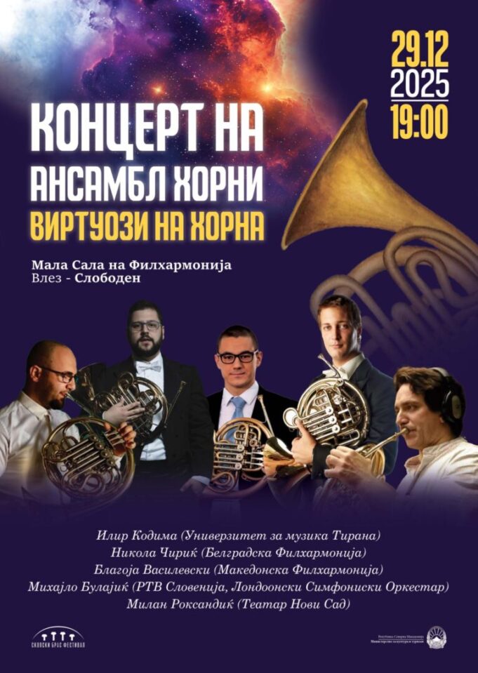 На 29 декември 2025 година, со почеток во 19:00 часот, во малата сала на Филхармонија ќе се одржи концертот „Виртуози на хорна“, последниот настан од петтото јубилејно издание на Скопски Брас Фестивал.