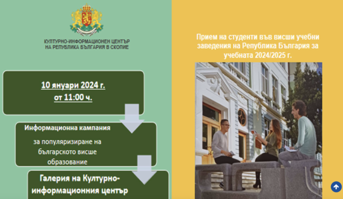 На 10 февруари (сабота) со почеток од 11 часот во галеријата на Бугарскиот културно-информативен центар во Скопје на ул. Никола Вапцаров бр. 6 ќе се одржи средба со кандидат студентите кои сакаат да студираат во Бугариja. Средбите се дел од информативната кампања на Министерството за образование и наука на Република Бугарија за приемот на државјани на РС Македонија во бугарските високообразовни институции за 2024-2025 според одлуките на бугарската влада ПМС 103/1993 и ПМС 228/1997, jавува Трибуна.