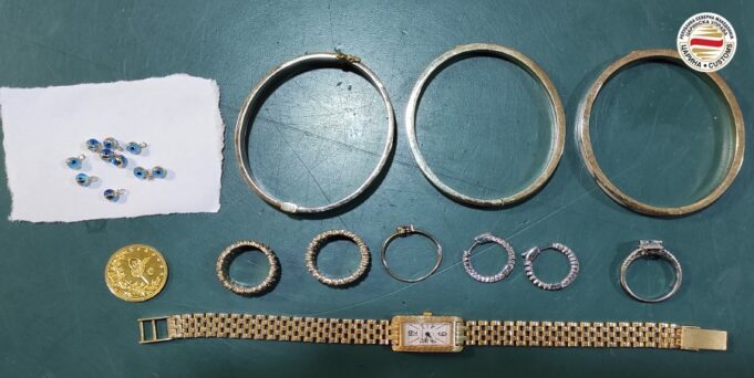 – 19 парчиња златен накит и еден златен рачен часовник, откриени при контрола на автобус со турски регистарски таблички кој сообраќал на редовна линија на релација Истанбул-Печ, пријавен за влез во државата на граничниот премин Деве Баир. При преглед на автобусот и багажот на патниците, во ранец на косовски државјанин, патник во автобусот, бил пронајден беџ за посета на саем за накит во Истанбул. При личен претрес на патникот, во џеб од неговите фармерки биле пронајдени 10 златни приврзоци со син камен, 1 прстен бело злато со бел камен, 1 златен прстен со виолетов камен, 2 златни прстени со зелен камен, 2 обетки од бело злато, 3 златни нараквици и 1 златен часовник марка GENEVE, а во неговиот паричник била пронајдена една златна монета. Истите се привремено задржани а против патникот ќе биде поведена соодветна постапка.