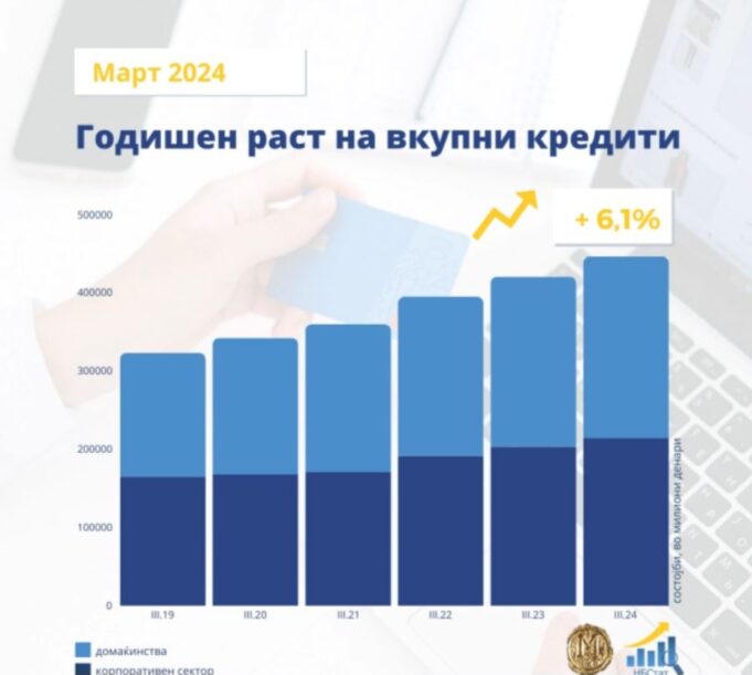 Вкупните кредити, во март, забележаа месечен раст од 0,3 проценти, поради зголеменото кредитирање на секторот „домаќинства“. Годишниот раст изнесува 6,1 процент и се должи на повисоките кредити на двата сектора, со поголем придонес на секторот „домаќинства“, објави денеска Народната банка.